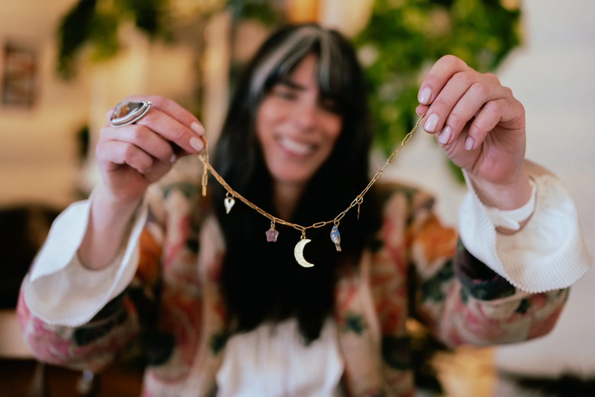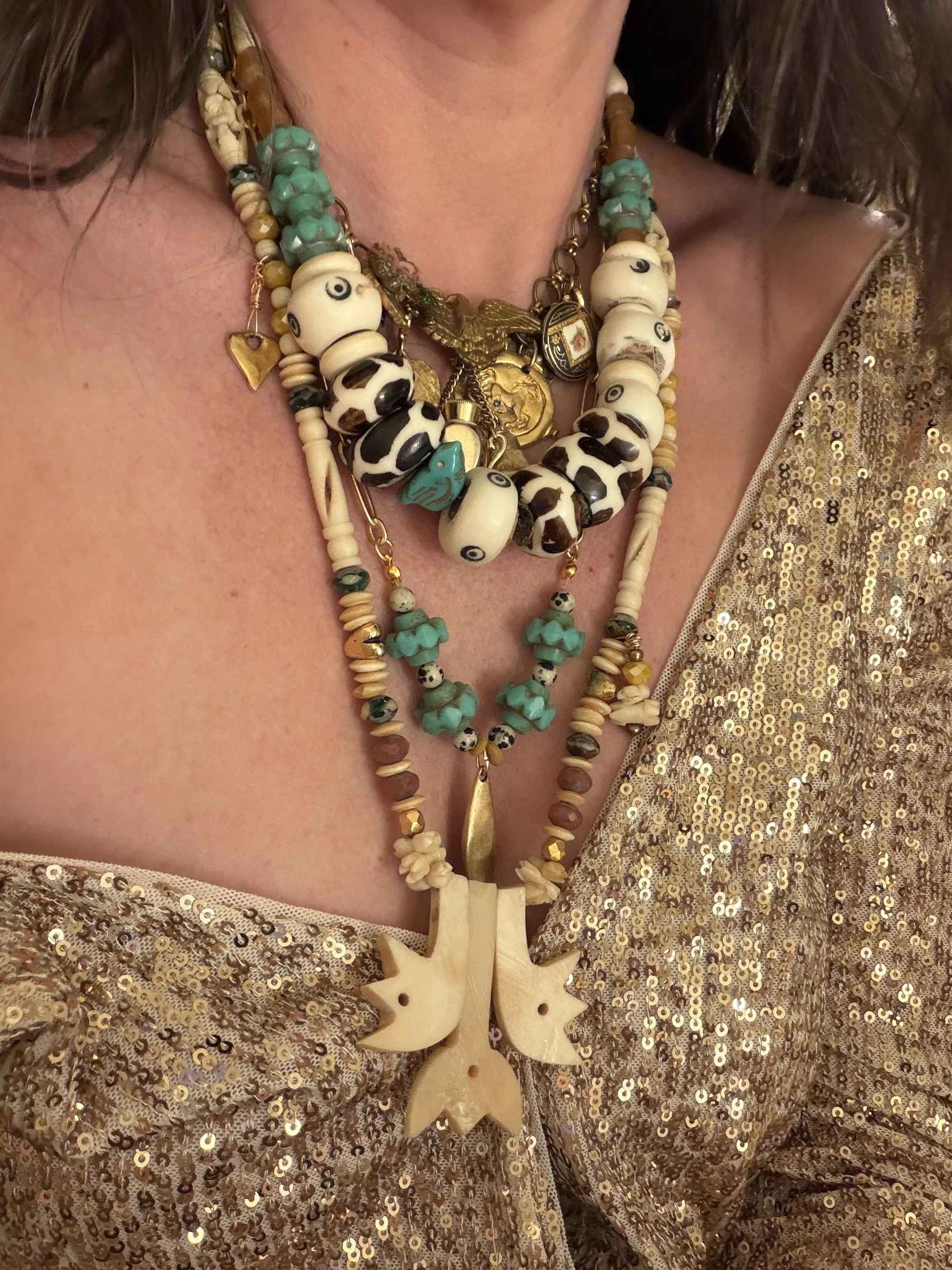 Each necklace designed by Alaina incorporates storied vintage charms, found pieces and beads to bring you a modern, bold and timeless style. Most pieces are one of a kind.